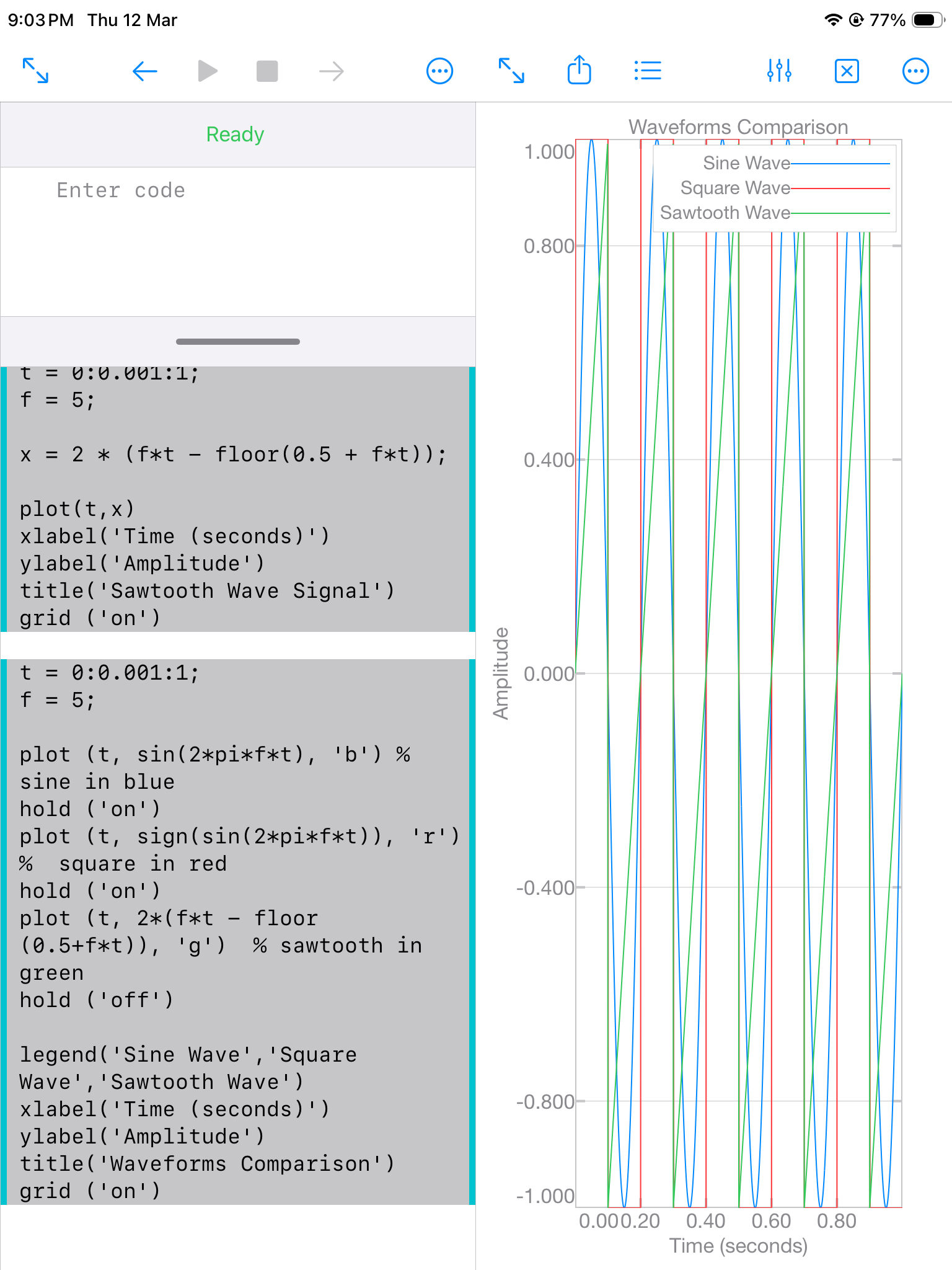 Students will generate common periodic signals such as sine waves, square waves, and sawtooth waves and analyze their properties using MATLAB plotting functions.